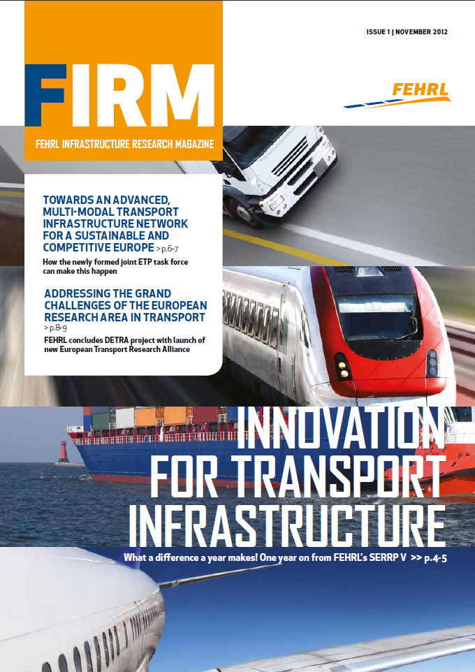 This first issue outlines the progress made on FEHRL's Strategic European Road Research Programme (SERRP V) and flagship Forever Open Road programme, as well as the key projects PILOT4SAFETY (within FEHRL's Safety & Security Research Area), Heroad and SMARTRAIL (Design & Production Systems), Re-Road (Energy, Environment & Resources) and the horizontal and dissemination projects DETRA, INCRIS and TRA2012. Also covered are Infravation 2014, the new ERA-NET PLUS for infrastructure innovation and the new inter-European Technology Platform task force on transport infrastructure. Contact Catherine Birkner, FEHRL Communications Officer, at catherine.birkner@fehrl.org with any feedback on FIRM and if you would like to request a printed copy. Files: · FEHRL_firm_LR.pdf