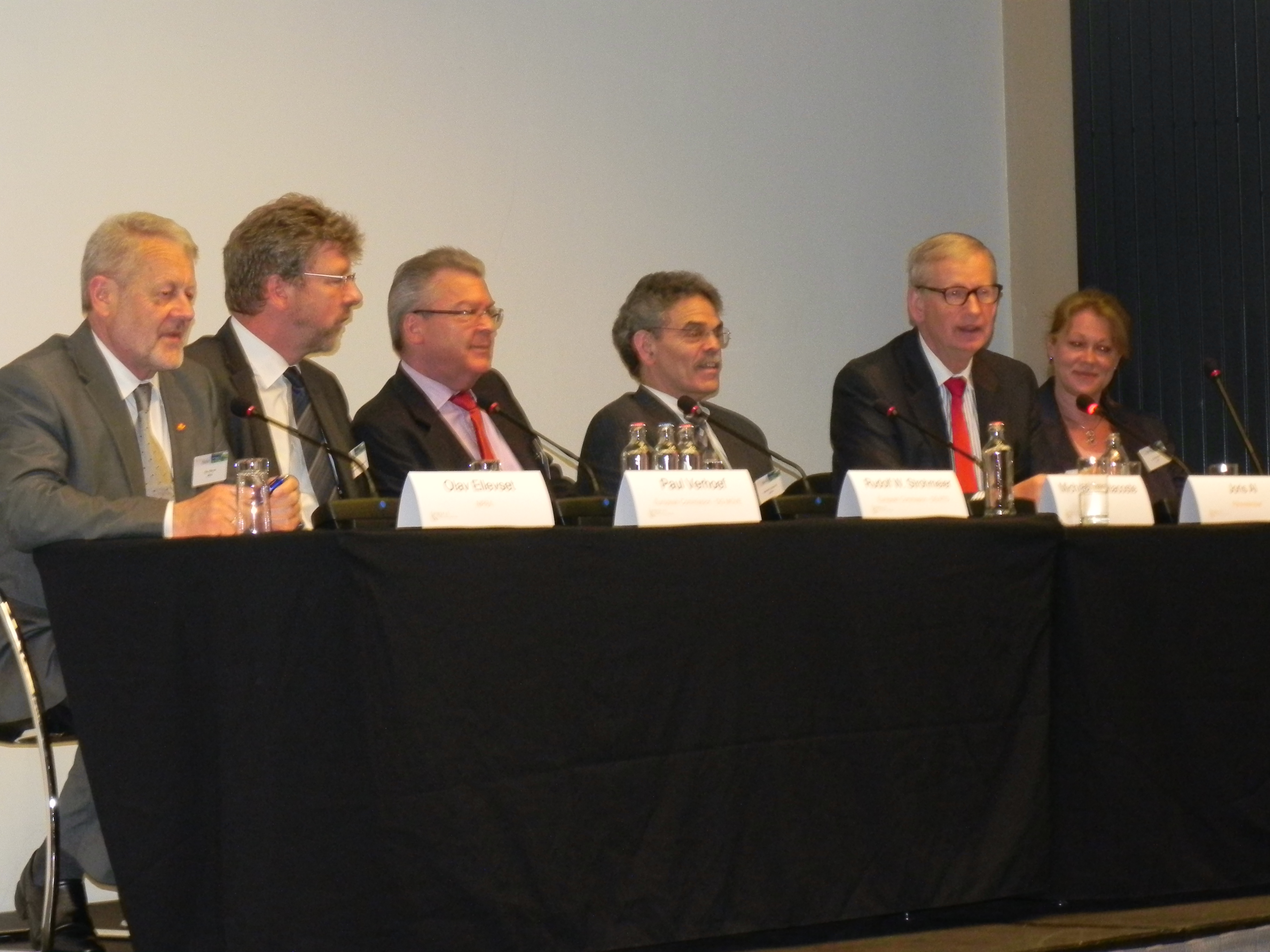 This first session on 5th June featured a rich blend of high-level speakers from the National Road Authorities (NRAs) and European Commission (EC), giving a harmonious mix of policy-focused and more technically-oriented presentations. Joris Al opened the meeting by reminding people of the history of FIRM13 and FEHRL’s role to progress Advanced and Innovative Construction and Maintenance through its vision, flagship Forever Open Road (FOR) programme and work to develop Infravation. From the EC, Paul Verhoef of DG MOVE underlined why transport infrastructure was a must for our economy and was high on his unit’s list of priorities with a focus on delivery and deployment. Rudolf Strohmeier of DG Research & Innovation (see photo to right with Joris Al) complemented his colleague’s presentation with information about Horizon 2020 and the EC’s plans for road research. He again highlighted the crucial role that infrastructure research will play in the development of the 21st century transport system.