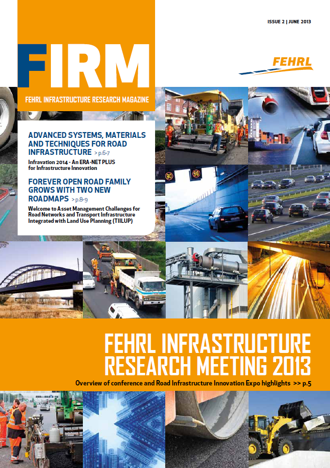 Click here or on the link below to take a look at the second issue of the FEHRL Infrastructure Research magazine (FIRM), which was distributed at last week's FEHRL Infrastructure Research Meeting 2013 (FIRM13) and is in the process of being distributed to FEHRL members and key transport infrastructure stakeholders. This second issue focuses on the highlights of FIRM13, and most of the programmes and projects covered also featured on the FIRM13 agenda. This includes the ERA-NET PLUS Infravation action, the five Forever Open Road roadmaps that are now available, the MIRIAM, MIRAVEC and TRIMM projects and the joint European Technology Platform (ETP) task force.